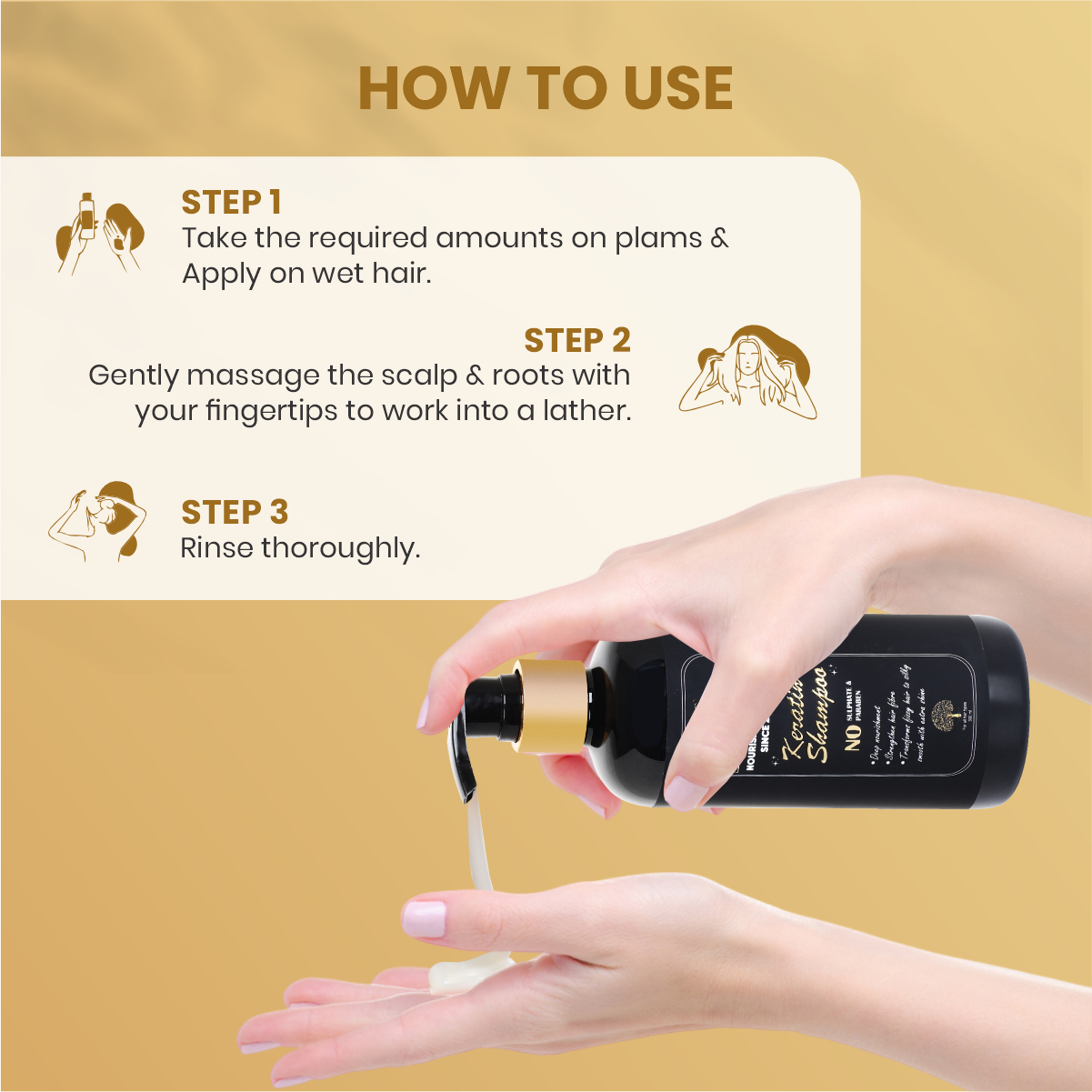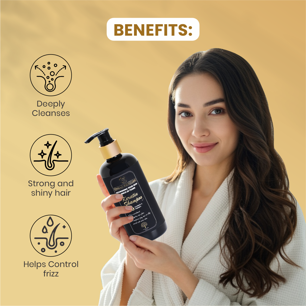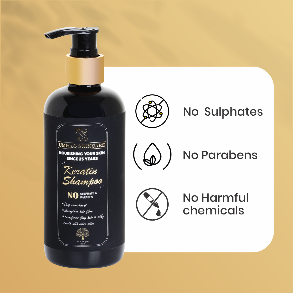 Transform your hair care routine with Umrao Skincare’s Keratin Shampoo—a luxurious formula designed to rejuvenate, strengthen, and add natural shine to every strand. Expertly crafted without sulphates or parabens, this shampoo delivers gentle yet effective cleansing, making it perfect for chemically treated, dull, or damaged hair. Enriched with herbal extracts and botanical proteins, our shampoo helps control frizz, improve manageability, and restore moisture balance—making it ideal for daily use on all hair types, including color-treated hair. Infused with natural ingredients and herbal extracts, this formula helps repair damaged hair while keeping it soft, manageable, and healthy-looking. Dermatologically tested